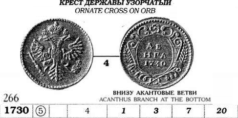 26 фев 2013, 00:59:40 (изменено) Ваша Деньга перечекан с Петровской копейки штемпелями как у Биткин-266, но с шестью лепистками розетки. Наверно более редкая чем с пятью, но т.к. Биткин не оговаривает условие розетки иметь 5 или 6 лепистков, судить об этом пока сложно. Вот вам скан:По поводу моей, вот описание на данный момент. И одно маленькое замечание по поводу короны, она закрытая, а не открытая, думаю это тоже стоит указать. Или я ошибаюсь? Интересно часто встречается это или нет?1730 Деньга - тип оборотной стороны не описанлиц. ст: 4 ряда перьев в хвосте, узорчатый крест державы и узкая корона (как Биткин-266), но корона закрытая.об. ст: 12 листьев в ветке лавра, розетка с 6 лепистками, внизу не окантованые листья (тип не описан). Изменено 3 окт 2015, 16:34:44 пользователем Лика-33 2.9.3 1 Поделиться сообщением Ссылка на сообщение Поделиться на другие сайты