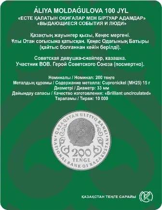 15 окт 2025, 18:47:00 Национальный Банк Казахстана (далее – НБК) выпускает в обращение коллекционные монеты ÁLIYA MOLDAǴULOVA. 100 JYL из серии «Выдающиеся события и люди». О коллекционных монетах ÁLIYA MOLDAǴULOVA. 100 JYL Монета посвящена Алие Нурмухамбетовне Молдагуловой – Герою Советского Союза, участнице Великой Отечественной Войны. В дизайне монеты использовано портретное изображение героини. Монеты изготовлены из сплава мельхиор (МН 25), массой 15 грамм, диаметром 33 мм, качеством изготовления brilliant uncirculated, номиналом 200 тенге, тиражом 10 000 (десять тысяч) штук. 3 Поделиться сообщением Ссылка на сообщение Поделиться на другие сайты