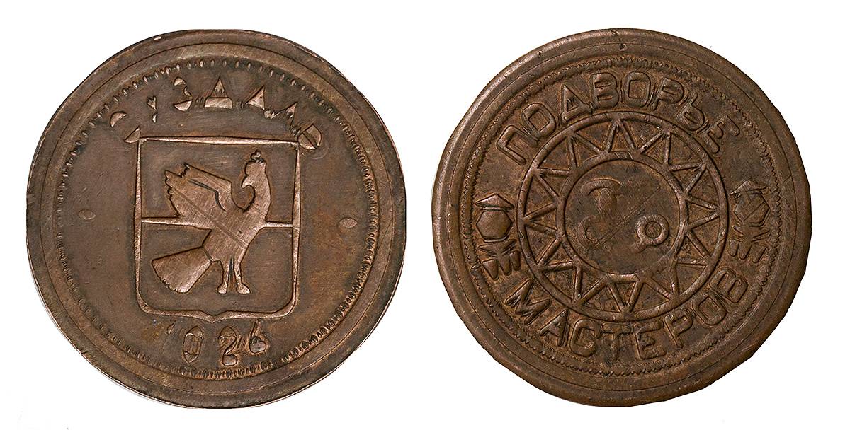 "Подворье мастеров" - это Суздальский бренд, который используют в городе многие предприятия и организации, в том числе - чайная, гостевой дом, магазины, художественный салон, кафе, рестораны... так что это какой-то рекламный, туристический сувенир... цифры 02 могут свидетельствовать и о какой-либо утилитарной роли жетона в вышеперечисленных заведениях... ИМХО.