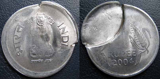Brockage случается когда отчеканенная монета застряла в штемпеле и новая поступившая монета чеканется с одной стороны нормальным штемпелем, а с другой стороны уже отчеканеной монетой и в результате новая, бракованная монета будет иметь с одной стороны нормальное изображение, а с другой точно такое же изображение только в негативе. НИКАК ИНАЧЕ. Partial brockage это точно тот же самый процесс, но когда новая заготовка не полностью зашла в чеканный отдел и изображения получились только на части кружка. Сомневаюсь что у вас может быть объяснение как показанная вами индийская монета могла быть отчеканена полностью, а потом ударена, причём что самое главное ТОЛЬКО С ОДНОЙ СТОРОНЫ «штемпелем» с застрявшей в нём монете. Как такое вообще возможно?