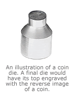 На наших мон.дворах штемпель - это такой обрезок длиной с палец, абсолютно одинакового диаметра (чуть меньше, чем рабочий диаметр кольца) что с одной стороны, что с другой. Конструктивно у нас нет никакой разницы между ударными и пружинными штемпелями, и они взаимозаменяемы до такой степени, что у нас штемпель в патрон можно загнать тыльной стороной наружу, и потом таким образом еще и монет начеканить, и такие монеты существуют.