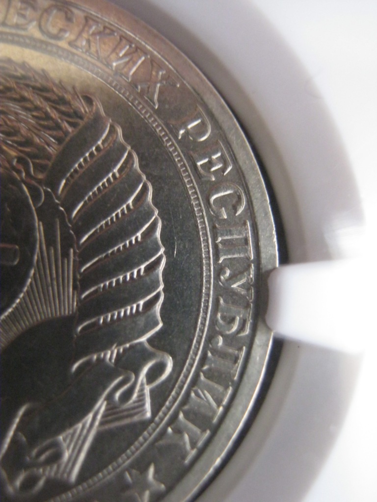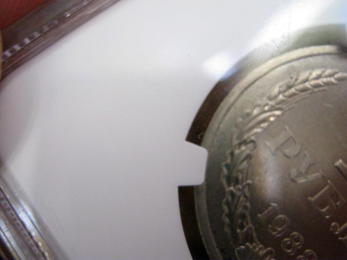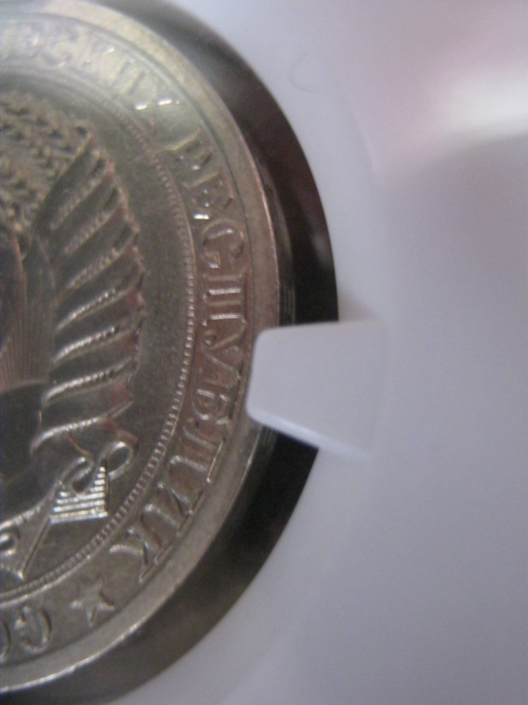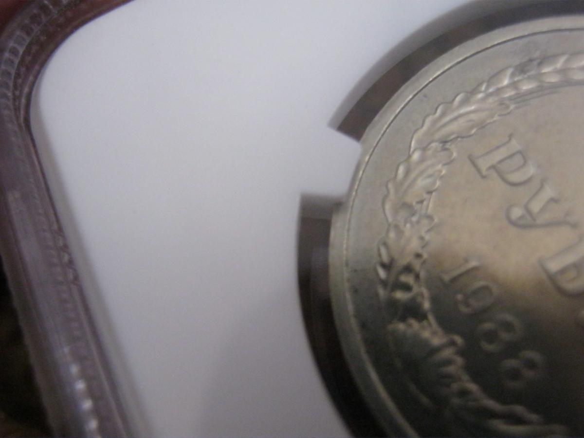 Есть некие предположения подозревать изменения гурта в указанном месте. Хотя, вроде, этот кусок находится над "8". Хорошо бы фото над тем местом, где должна быть последняя цифра даты, с обеих сторон монеты, вплотную к пластмассовому держателю. Похоже, что там тоже гурт деформирован, хотя и меньше.