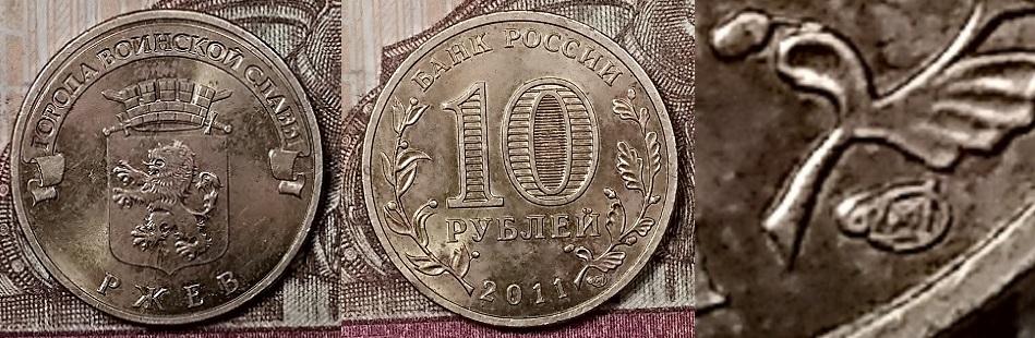 Приветствую. ГВС Ржев. 10 рублей 2011 года. По Ю.К. штемпель В. Нечастая. Аверс: знак СПМД толстый, приподнят.