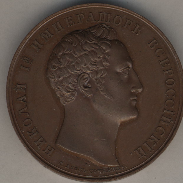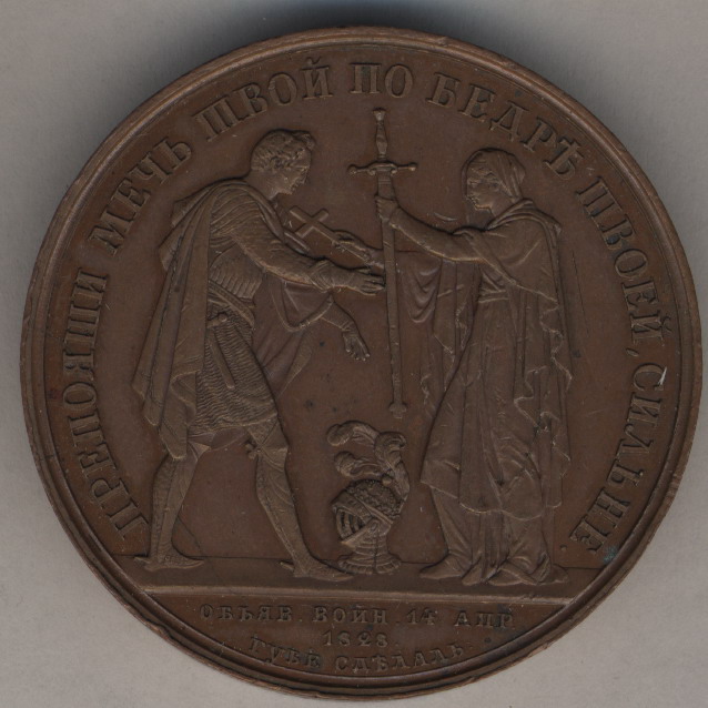 А медаль с Николаем I - в честь русско-персидской войны 1828 года, у меня такая есть, но моя на русском языке. Очевидно, они на двух языках делались ? Для России, и для каких-нибудь зарубежных дипломатических подарков ? Надпись вокруг двух фигур, там где Николая благословляют, боюсь ошибиться, но вроде того - "Препояши мечь свой по бедре сильне"...