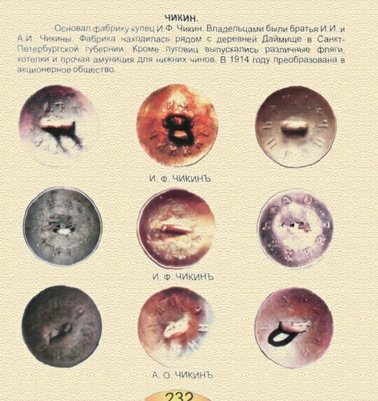 Основал фабрику купец И.Ф. Чикин. Владельцами были братья И.И. и А.И. Чикины. Фабрика находилась рядом с деревней Даймище в Санкт-Петербургской губернии. Кроме пуговиц выпускались различные фляги, котелки и прочая амуниция для нижних чинов. В 1914 году преобразована в акционерное общество.