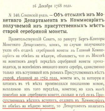 19 июл 2015, 04:54:08 Да и еще: Приведенный ТС указ, который n+1 раз советуете мне прочитать, направлен Сенатом в "присутственные места" и касается исключительно порядка изъятия из обращения серебряных монет прежних монархов: - канцелярии, коллегии, конторы действуют так-то, оплачивая собранные монеты таким образом, - суды и т.п. поступают так-то.... - артиллерийские команды - так-то... Ни одна из этих организаций с чеканкой монет дела не имеет, и давать им распоряжения по приводу в пробу нет ну сАвсем никакого смыла. (Кстати, учет "по императорам" нужен для того, чтобы затем, после переплавки и привода в 72 пробу, начеканить ровно столько монет, сколько изъяли) "Хао! Я всё сказал!"(с)Ч.Б.З. 0 Поделиться сообщением Ссылка на сообщение Поделиться на другие сайты