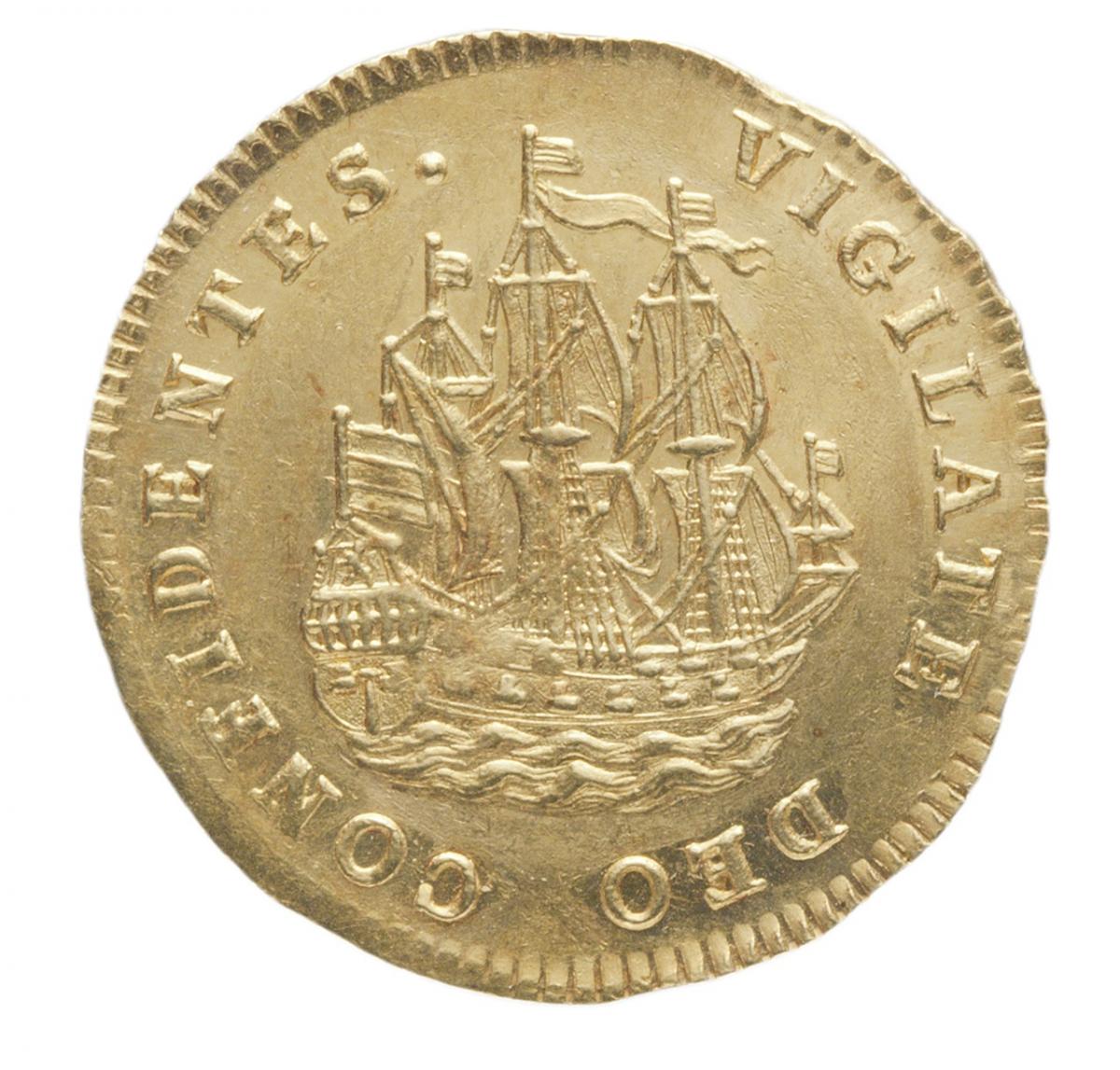 На реверсе золотого "корабельного шиллинга" вместе с трехмачтовым кораблем изображена легенда на латинском языке, которая переводится, как " Бодрствуйте, уповая на бога. ". На аверсе изображен герб, увенчанный короной между номиналом монеты.