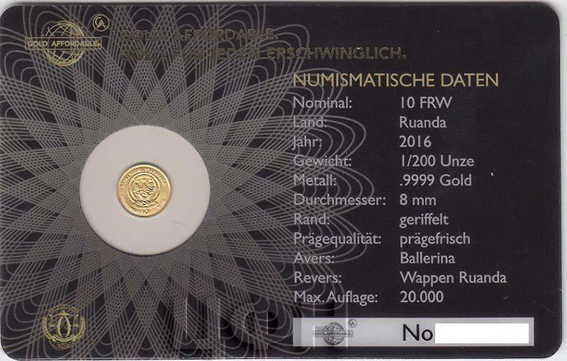 26 мар 2020, 20:43:21 Только что, Лика-33 сказал: В рамках нумизматической программы "GOLD AFFORDABLE" (Доступное золото) Руанда в 2016 году продолжила выпуск коллекционных монет в блистере серии «ICONS OF THE WORLD» (Монетные символы мира) с изображением значимым золотых монет различных стран, выпускаемых в разные годы. Монеты отчеканены на MDM. На аверсе изображен герб Республики Руанда, вокруг которого расположена легенда: «BANKI NKURU Y´U RWANDA», «AMAFARANGA 10 ICUMI». На реверсе изображена балерина с палладиевых монет. Надписи: «ICONS OF THE WORLD», «2016», «.9999 FINEST GOLD 1/200 OZ OR PUR». Схематически выполненный земной шар является эмблемой данной серии, а переплетённые буквы «GА» (GOLD AFFORDABLE) - аббревиатура названия нумизматической программы. 2 Поделиться сообщением Ссылка на сообщение Поделиться на другие сайты
