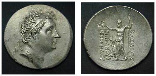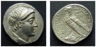 На первых двух портреты богов, а третья монета - Никомед II, правитель Вифинии. На четвёртой - Деметрий II из династии селевкидов. Чекан финикийского города Тир, тетрадрахма.