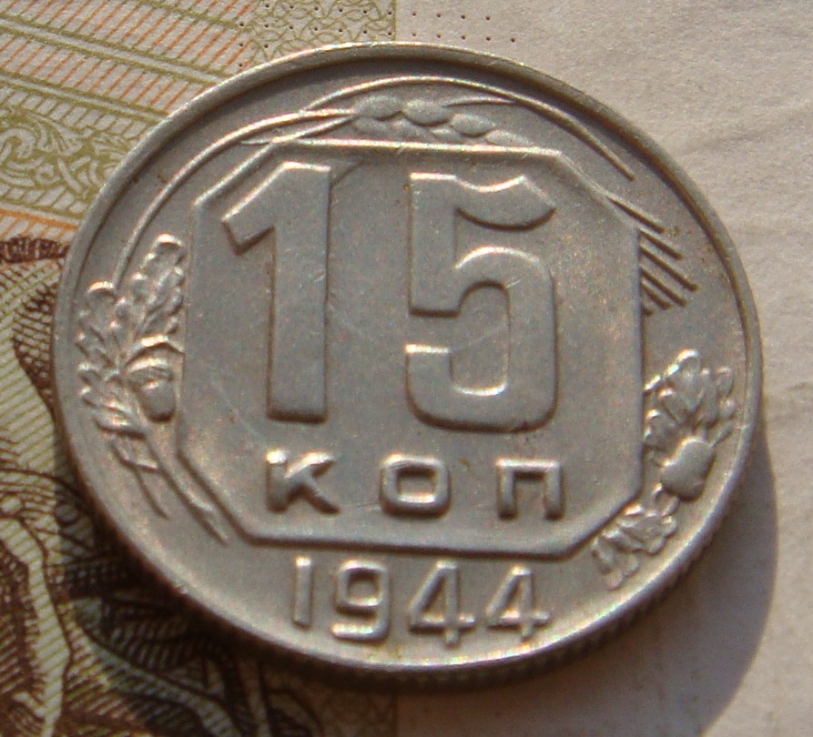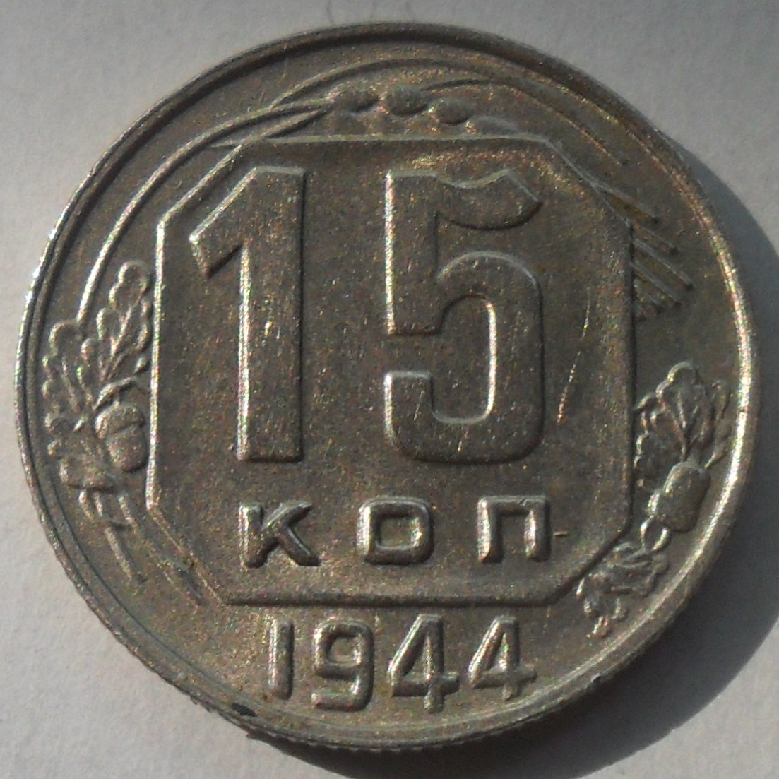 Была у меня  такая 15-ка 1944 г. Вес 2,9 г. Продал на соседнем в сентябре 2014 г. за 1600 руб.