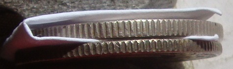 По-моему, интересный экземпляр. Хотя заметные перевесы нередко встиречаются в мельхиоровых монетах 43-44, но здесь действительно перевес значительный, позволяющий утверждать, что полоса для 20 коп.