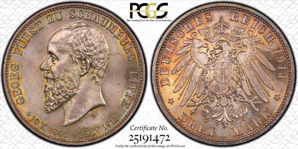 Шаумбург-Липпе, 3 марки 1911. PCGS MS65