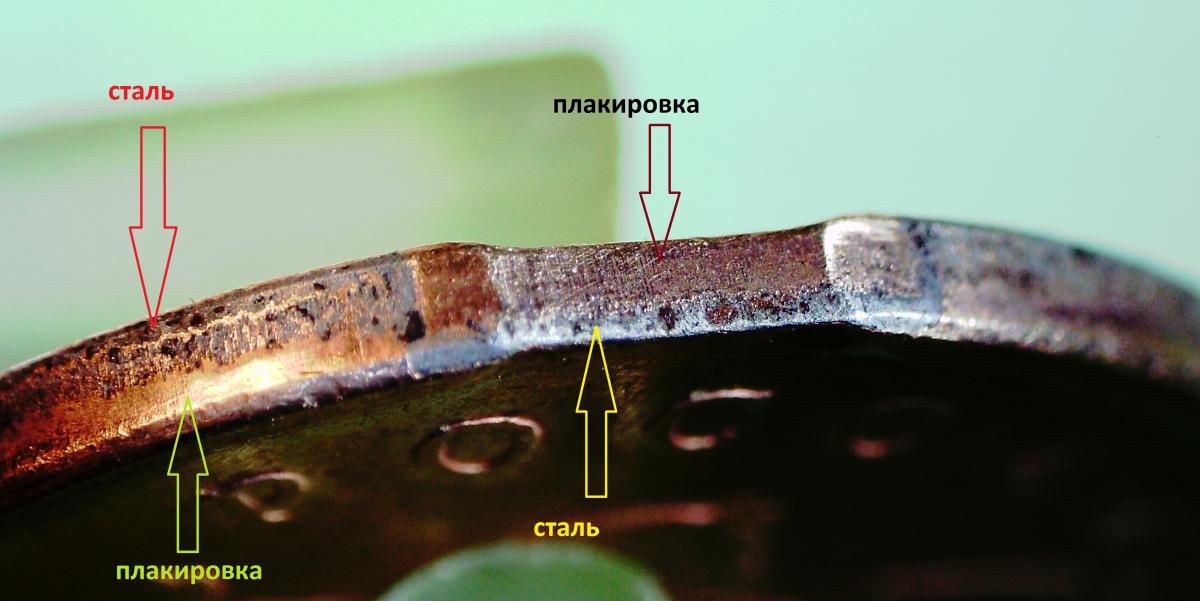Всем привет! Наконец-то дома. Показываю "виновницу" моего вопроса. Если кто-то может показать торец "края листа" на плакированной монете (или просто описать расположение плакировки), буду очень благодарен.