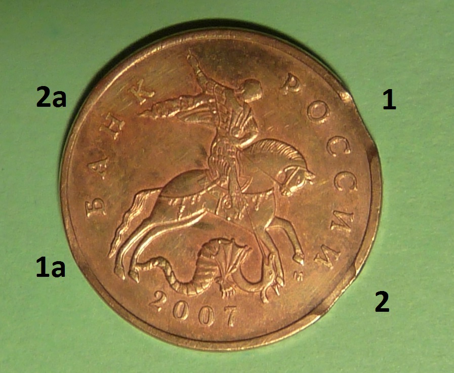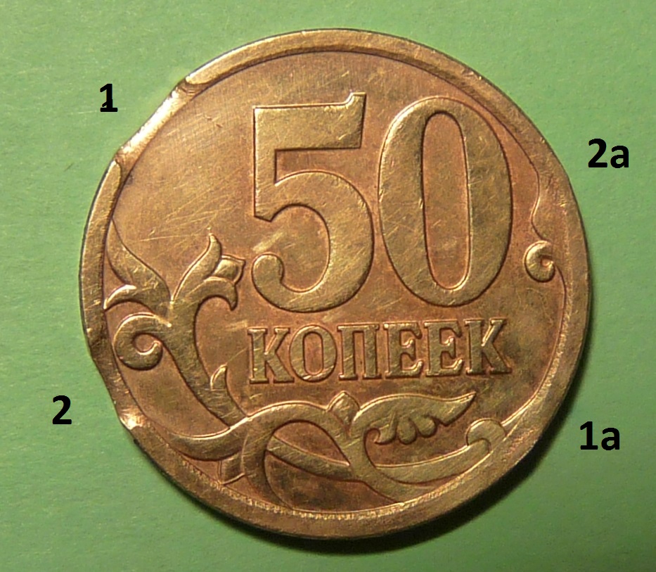 При вырубке заготовки из целого листа, пуансон, движущийся сверху вниз, сразу обрезает верхнюю плакировку, и продавливая заготовку вниз, натягивает нижнюю плакировку на гурт заготовки. Нижняя плакировка не обрезается точно, т.к. между матрицей и пуансоном есть зазор. Бывают, правда, случаи, когда обе плакировки обрезаются практически сразу (это при использование новых пуансона и матрицы), но всё равно одна из них будет немного налезать на гурт. Такое явление характерно, например, для магнитных 10к 2006 М. Кстати, такие монеты быстрее сгнивают, т.к. большая часть стального гурта оказывается открытой. При этом, нижний угол заготовки меж плоскостью и гуртом будет иметь радиус, а верхний угол - будет с прямым углом, и возможно даже с облоем.