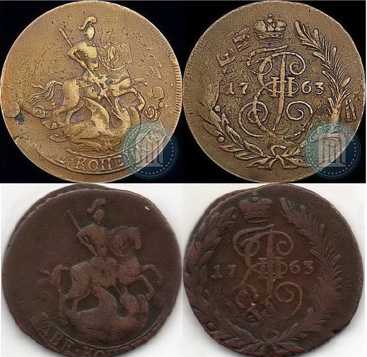 Но у моего хорошего знакомого появилась монетка - 2 копейки 1763, осторожно назовем ее так, Спб МД. Она одношемпельная с двушкой из "Александра". И самое интересное, у нее тоже нет буковок.