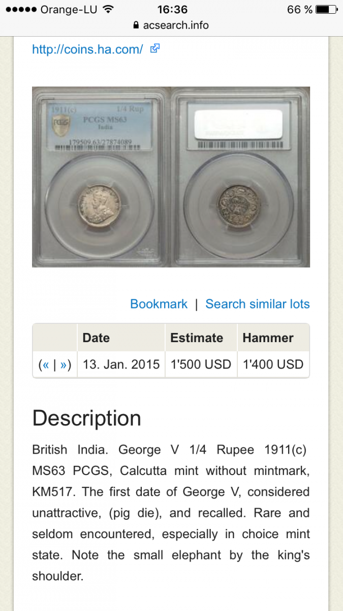 И продажа 1/2 рупии 1911 года, правда, MS64:
