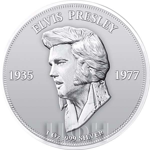 На реверсе отчеканено полированное изображение Элвиса Пресли на фоне матового поля. Надписи: имя американского певца и актёра - «ELVIS PRESLEY», его годы жизни - «1935 - 1977» и технические характеристики металла - «1 OZ .999 SILVER».