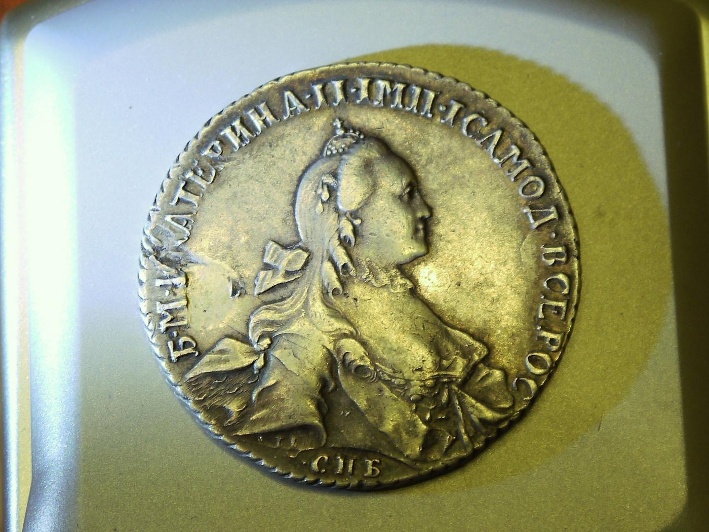 Эта монета ,как и 1774г, тоже в посредственном состоянии. Огромная царапина слева от портрета снижает её стоимость до 8 - 10 т.р.
