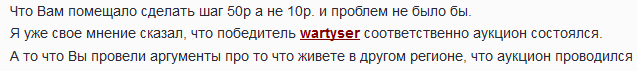 5 дек 2018, 11:49:01 1 минуту назад, МанчестерRUS сказал: Что Вы проглядели - это Ваши проблемы. Что Вы правила не знаете - это тоже Ваши проблемы. У нас уже не первый день, и не первый месяц когда шаг не меньше 50р. Не нужно цепляться за это. Тем более аукцион длился не один день. Что Вам помещало сделать шаг 50р а не 10р. и проблем не было бы. Я уже свое мнение сказал, что победитель wartyser соответственно аукцион состоялся. А то что Вы провели аргументы про то что живете в другом регионе, что аукцион проводился не в то время, и все в этом роде. Это смешно. Третий раз вам задам вопрос: можно ли считать аукцион состоявшимся, если он организован с нарушениями? Вы уже крутитесь как уж на сковородке лишь бы не отвечать конкретно. Потому что наверняка понимаете, что на ваш ответ задам вам второй вопрос: "где ваши две руки "за", чтобы переиграть аукцион?" 0 Поделиться сообщением Ссылка на сообщение Поделиться на другие сайты