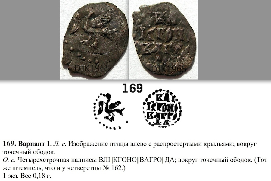 2 апр 2024, 07:42:17 С Империи Цитата "Великий Новгород. Новый Торг (Торжок). Деньга 1420-е - 1445 гг. Денежный двор Нового Торга. Л.ст.: «Птица вправо с поднятыми крыльями». Об.ст: «Четырехстрочная легенда: «ПЕЧАТЬ НОВОТОРЬСКАЯ». Серебро, 0,42 гр. Состояние UNC. Гулецкий Д. В., Петрунин К. М. «Русские средневековые монеты» (2017) – №7598А(редкость III), Гайдуков П.Г., Малыгин П.Д. «Новоторжские монеты» («Нумизматика и эпиграфика». Т. XVIII. 2011. С.232-243.) - как № 12. К 2010 г. авторам каталога было известно лишь 20 новоторжских денег и они считали их «одними из самых редких средневековых русских монет». Прекрасное сохранность." 1 Поделиться сообщением Ссылка на сообщение Поделиться на другие сайты