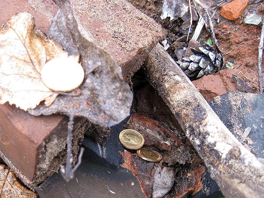 Это бывшие лагеря для военнопленных и полицаев крымских,татар...Места весьма не приятные. И вот как то в куче битого кирпича прибор заорал .... на "цветняк" Я ставлю на "дискрименатор" и чернину я не копаю.  Отрыл женский гнилой башмак.....плюнул и пошел дальше. Ночью проснулся и думаю: "А чевой то у меня прибор орал?" У меня ведь стоит "дискрим"!  Гдет о через неделю я вернулся туда ,нашел это место и башмак. Прибор показывает ""ЦВЕТНЯК" Я начал внимательно рассматривать этот башмак ...переломил его. он был гнилым совсем. И вот...