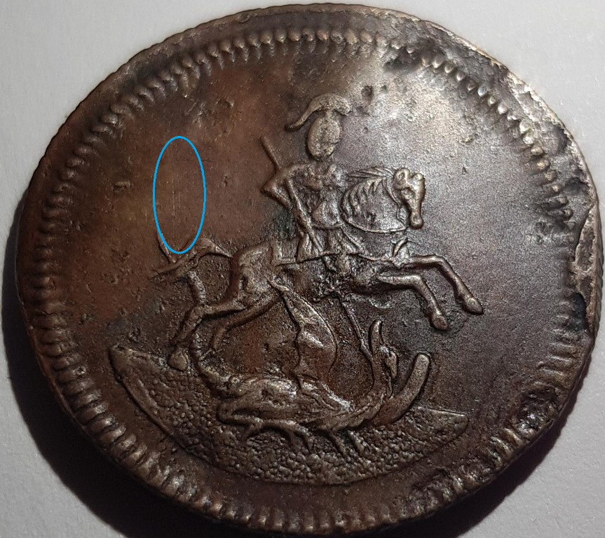 Вопрос в другом... Когда подлинный штемпель пришел в негодность, вырезали новый (тот где меньше земли под змием и наконечники выше основания даты). И все продавцы и каталогизаторы лепят оба варианта в одну кучу, а это принципиально разные монеты.