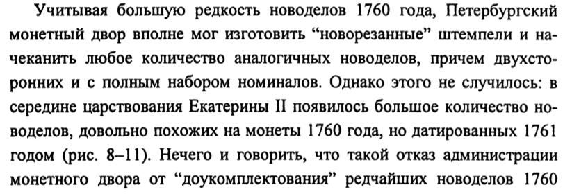 Как интересно! В 1760 и 1762 делали, а "посередине" не делали... Гениально! Вы там присутствовали в 1761 году? Этот "фантазийный" новодел отчеканен подлинными штемпелями в первой половине 19 века и как правильно написал Ширяков, представляет значительный интерес, как нумизматический памятник.