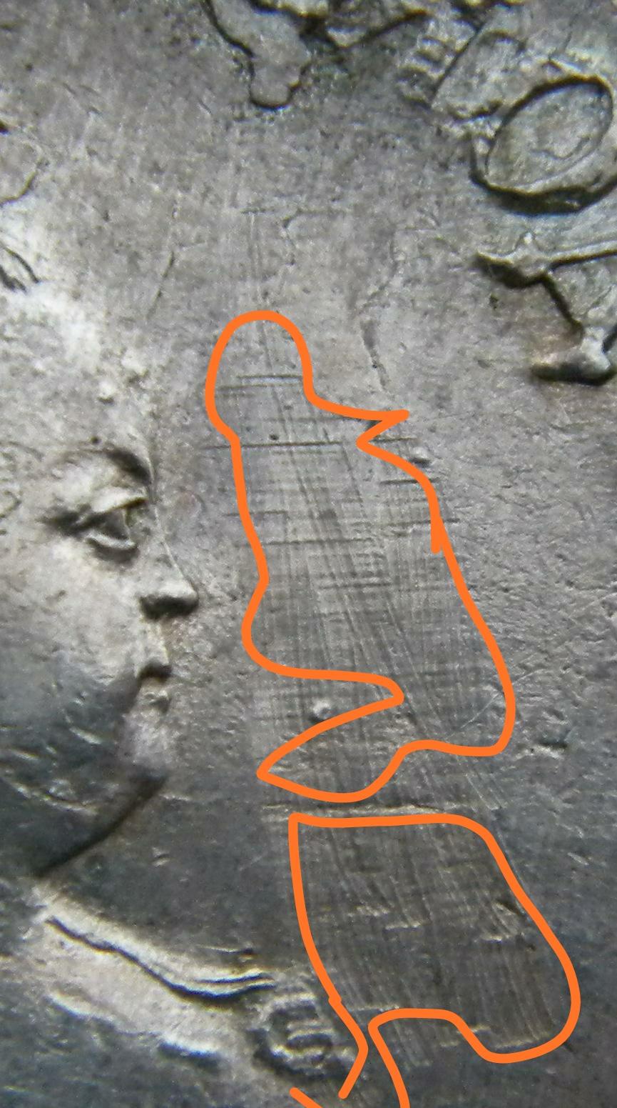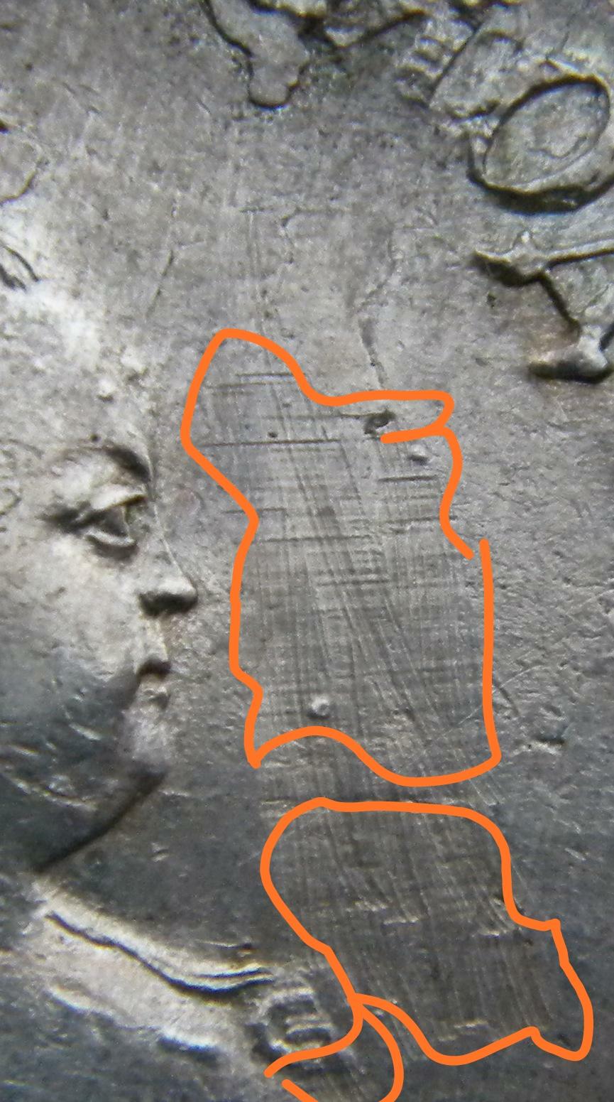 Полосы идут по "низкой" части рельефа, в одно месте. Обрати внимание на полосы на бюсте, это уж всяко не юстировка и не рукоблуд. В этом посте коллин пишет, что линии выпуклые относительно рельефа, а это значит что они ни как не могли появится на монете после чеканки