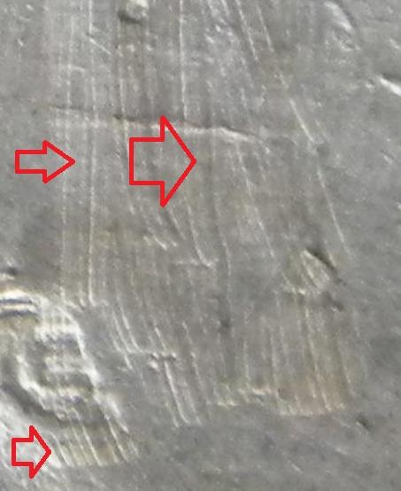 4. Просадка ниже уровня поля которая видится -, отлетевшие и заглаженные  слоения, края подгладили, размазали механически, нарочно замаскировав под выпуклые линии (пусть будет ремонт штемпеля). По скольку толщина слойки/слоек неравномерная для выравнивания поверхности применялись разные усилия и направление инструмента (второй край предполагаемой слойки).