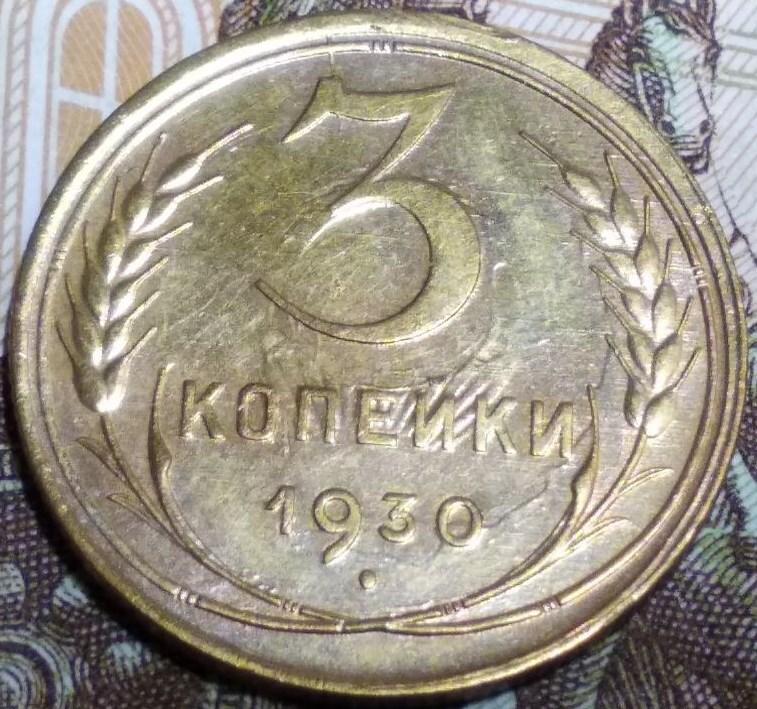 3 копейки 1930, "перепутка", штемпель 20 копеек 1924, буквы "СССР" - вытянутые. Оценка