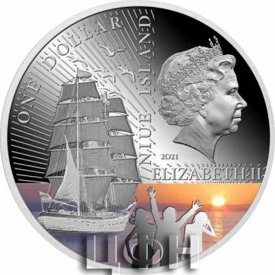 На аверсе монеты изображен корабль в море, над которым летают чайки. Внизу аверса молодые люди, вступающие в жизнь, встречают восход солнца на берегу моря, с надеждой глядя в будущее. В правом верхнем сегменте аверса - изображён портрет Ее Величества Королевы Елизаветы II. Легенда: имя королевы - «ELIZABETH II», год выпуска монеты - «2021», страна эмитент - «NIUE ISLAND» и номинальная стоимость - «ONE DOLLAR».