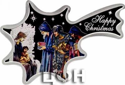 На реверсе в левой части изображён Библейский сюжет «Поклонения Волхвов», выполненное в технике цветной печати и указаны характеристики металла - «Ag 925». В левой части отчеканено название монеты «Happy Christmas» (Счастливого Рождества). Завершает дизайн орнамент из сияющих звёзд на темном небе.
