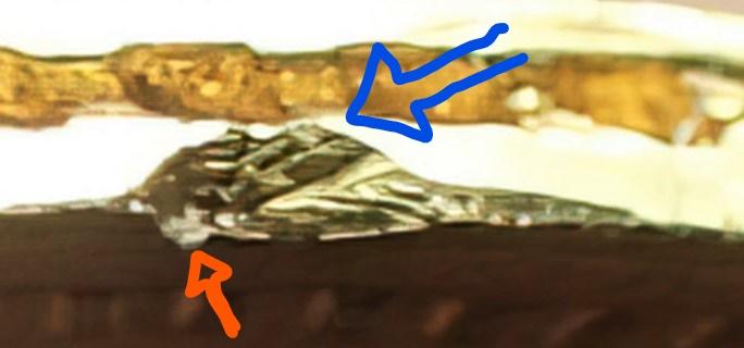 Ещё увеличил... Всё равно трудно сказать... Но, кмк, чтобы образовался такой выброс металла (оранжевая стрелка) и борозды, надо чтобы чем-то провели в направлении этих борозд (синяя стрелка).