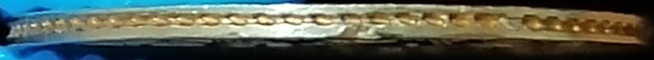Принесли ,оценить , ювелир с утра с головной болью , (в выходные дочку замуж выдавал ) ,решил сделать "запил " ,чтоб определить металл ,зажал в ювелирные тиски ,но с одной стороны "тряпочка " упала с тисков и получились "забоинка " и так два раза .