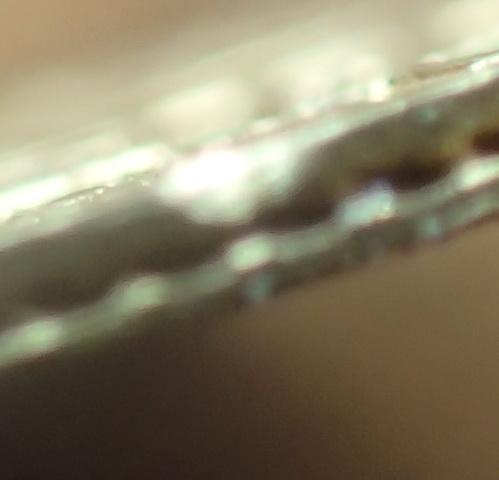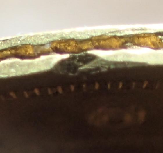 А не может ли это вообще быть выкусом? На это меня навели сходящиеся углом борозды на дефекте. Взяли в ломбарде маникюрные кусачки и отщипнули маленький кусочек на пробу? Не знаю, практикуют ли такое, но вдруг...