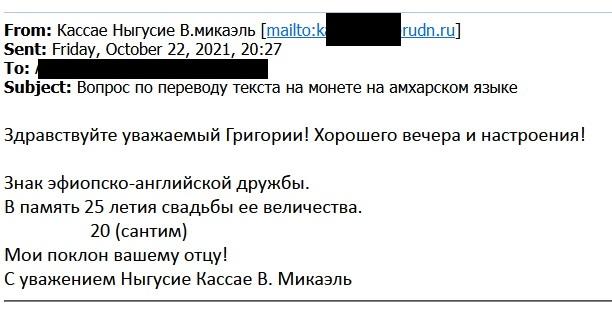 Тематику никто не оспаривал - юбилей свадьбы королевы, а вот с датой не все так просто. ... Я попросил еще посмотреть человека занимавшегося переводом документов с амхарского для мэрии Иэрусалима. Аверс . В знак дружбы Эфиопиии Англии. Реверс. В память свадьбы королевы двадцать пять ( буквами цифрами) лет. Внизу - 20 лет бракосачитания ( свадьбы). Почему так, никто объяснить не может. Каждый волен выбирать - 20 или 25 лет свадьбы. Номинала нет. Это не доллар.