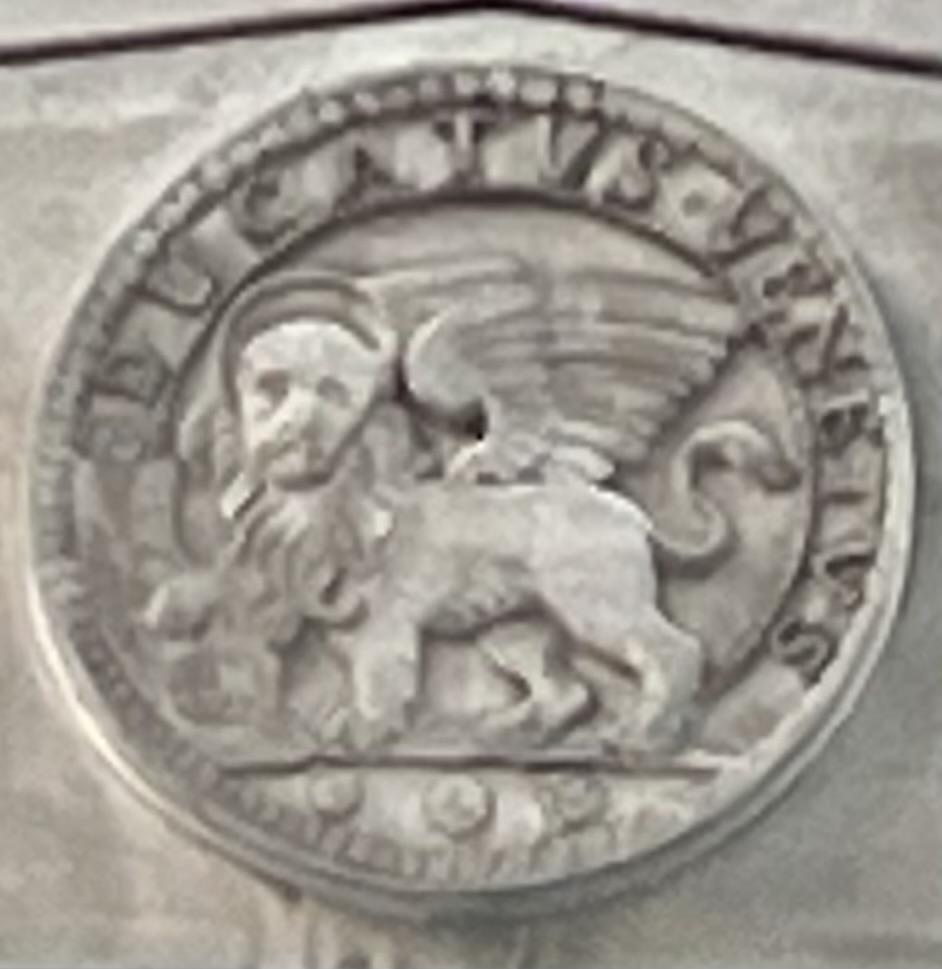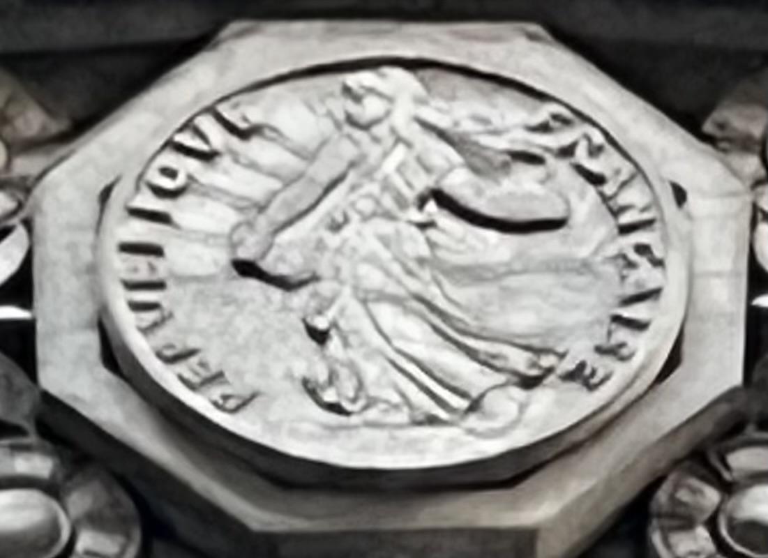 По всему периметру над окнами находятся круглые рельефы с монетами.