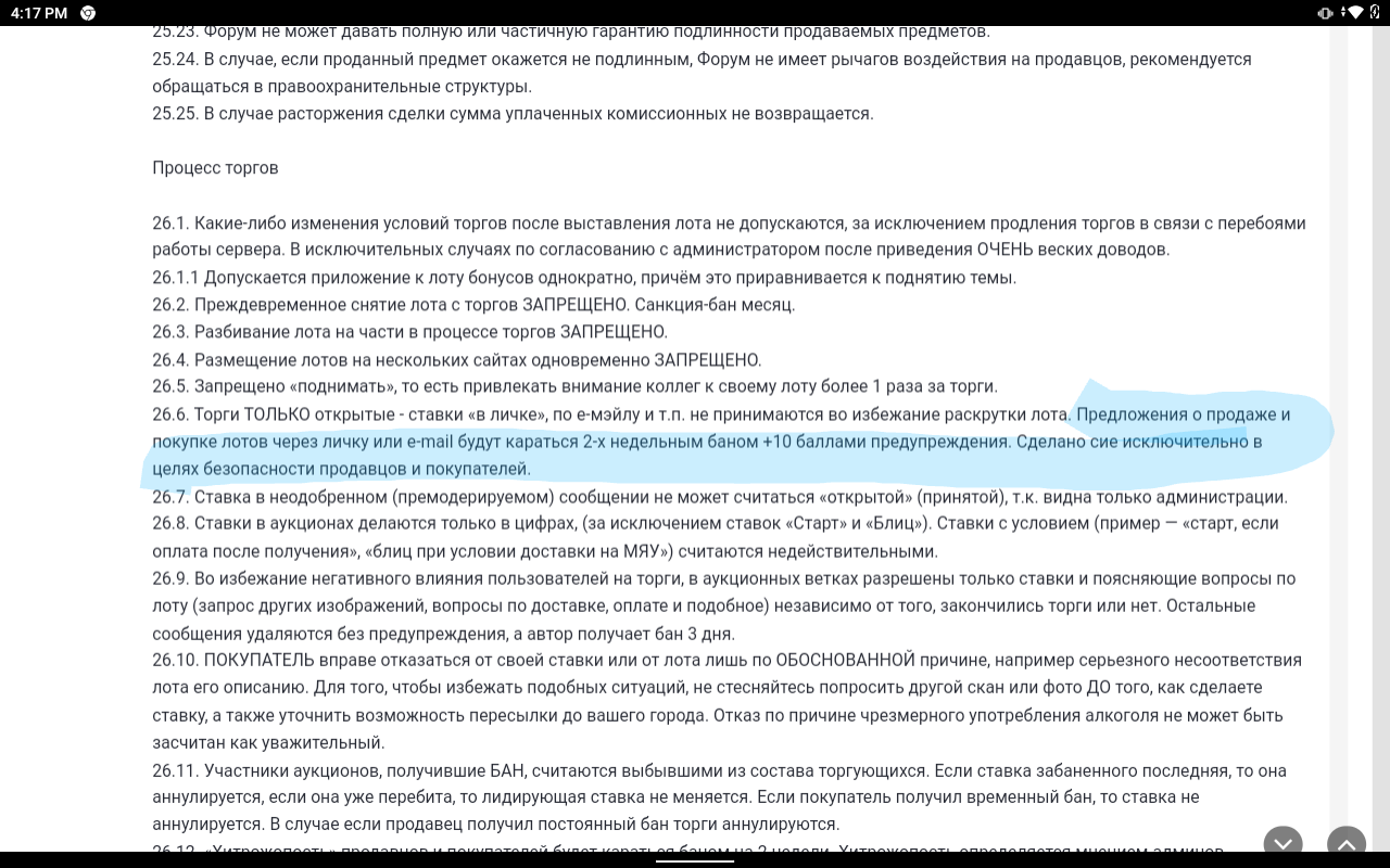23 ноя 2021, 15:06:18 1 минуту назад, Viktor Ergard сказал: Пункт 26.6 правил разве разрешает торговлю и предложения в личке. Разве была продажа в личке? Мало ли, кто и что предлагает, но была озвучена оценка, в личке, какой смысл выставлять дешевле? 0 Поделиться сообщением Ссылка на сообщение Поделиться на другие сайты
