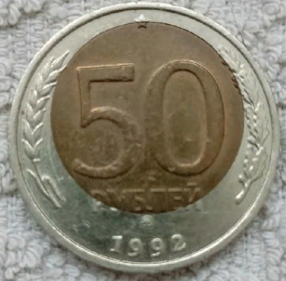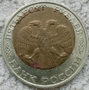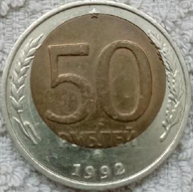 50 рублей 1992 ММД (брак - смещение при вырубке под внутреннюю вставку). Оценка.