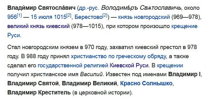 16 июн 2022, 15:09:26 В 13/06/2022 в 22:03, МНС сказал: Во-первых, Владимир никогда не был "великим князем" ... В 15/06/2022 в 17:35, Византиец. сказал: Очевидно, что информацию про «Великого князя» составители этикетки просто некритично и бездумно взяли из пресловутой «Википедии» ... Почему из "Википедии"? Почему некритично и бездумно? Так принято в историографии. Есть разные точки зрения, но, если подходить критично, убедительных доказательств, что Владимир никогда не был "великим князем", пока нет. 0 Поделиться сообщением Ссылка на сообщение Поделиться на другие сайты