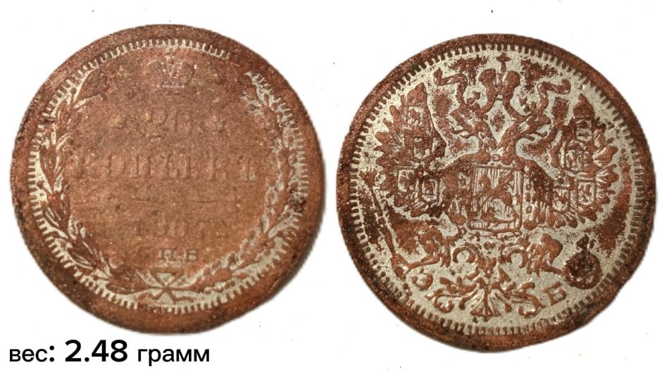 20 копеек 1907 эб чеканка. На фото одна и та же монета