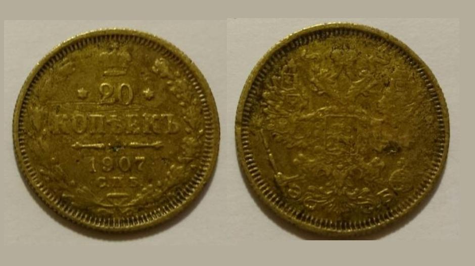 20 копеек 1907 вес 3.7 грамм диаметр чуть больше 22 миллиметров