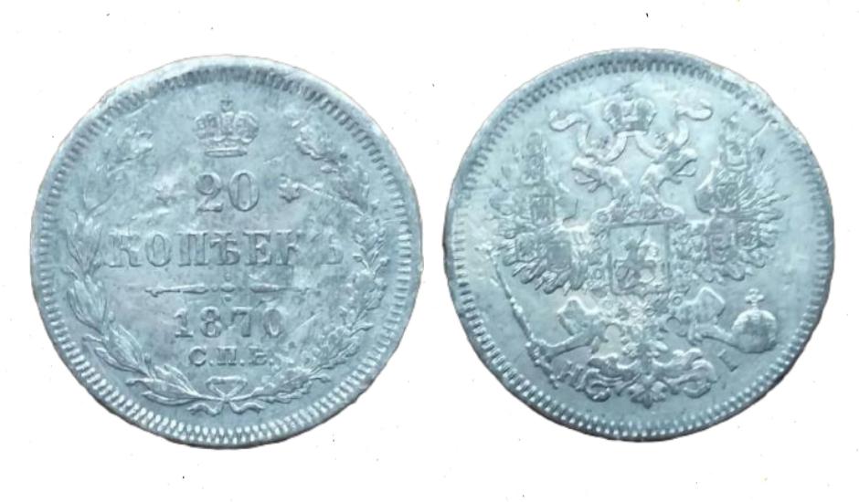 20 копеек 1870 не уверен на 100% , что это фальшак но по словам владельца металл мягкий скорее всего олово или сплав