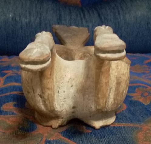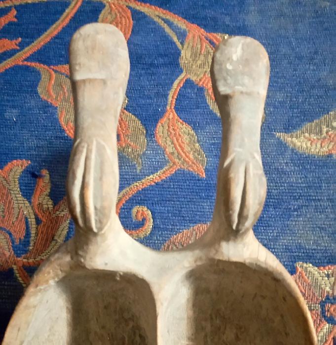 Такая мысль пришла)). Из этой посуды пьют двое из разных чаш. Если один выпил больше, значит он выпил у другого, остаток жидкости останется одинаковым в обеих половинках. Вообщем конструкция или для умеренного питья, или наоборот, для того что бы надуть партера по питью.