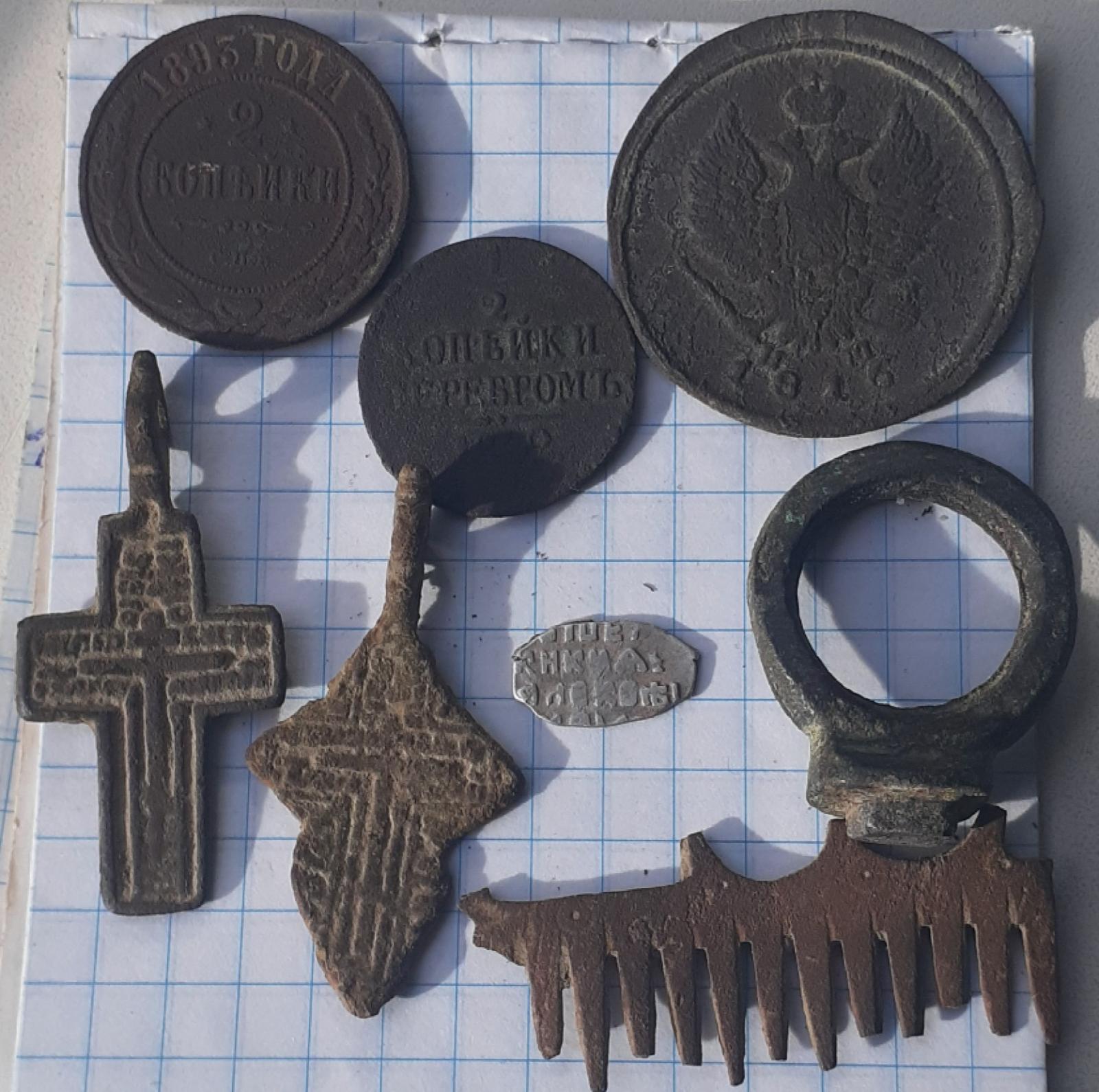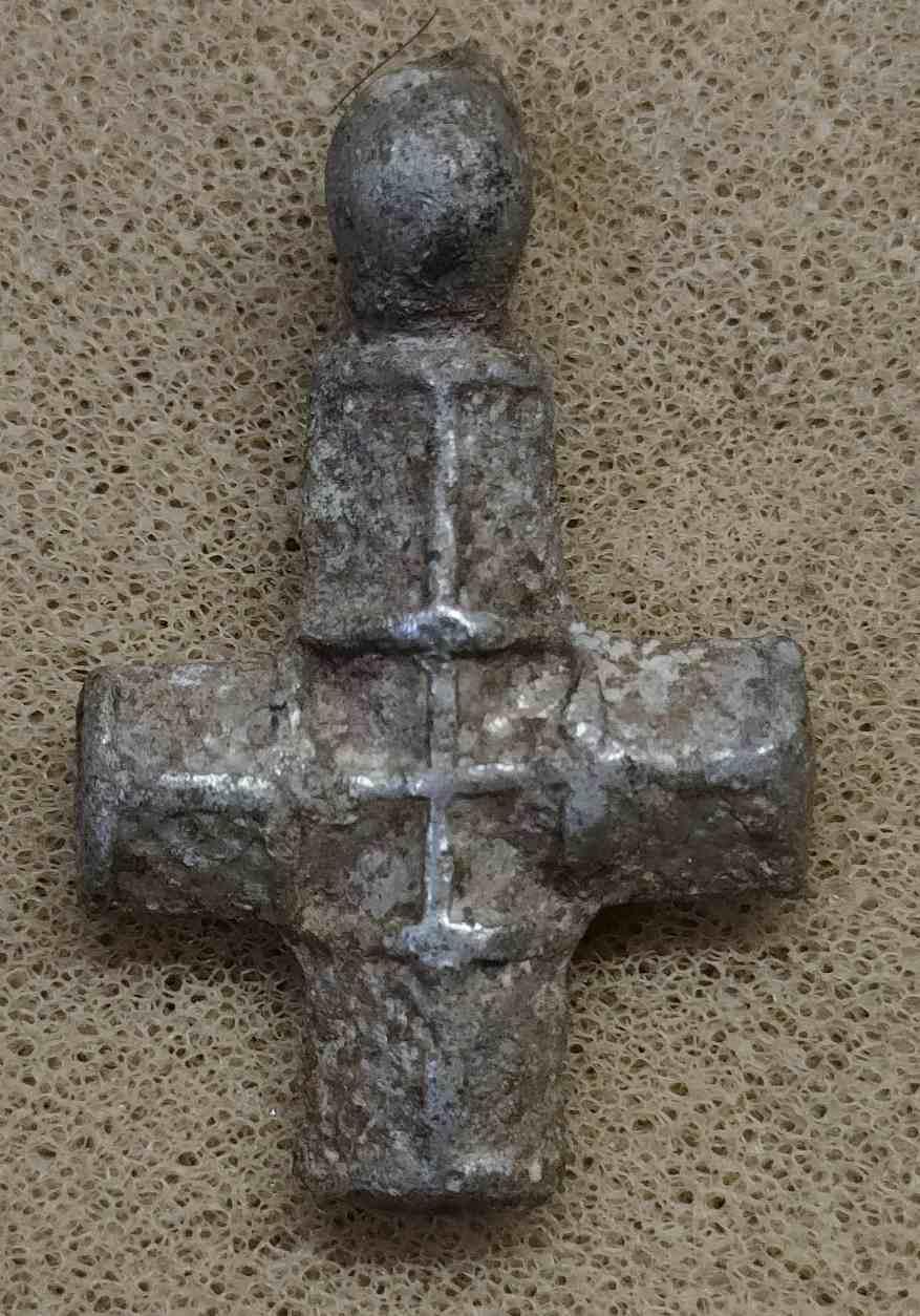Погулял сегодня по бывшей кукурузе. Ходить очень тяжело, скосили сантиметров на 30 от земли. Вот что попалось между рядами. Порадовал крестик. Если кто либо знает период - подскажите за спасибо..