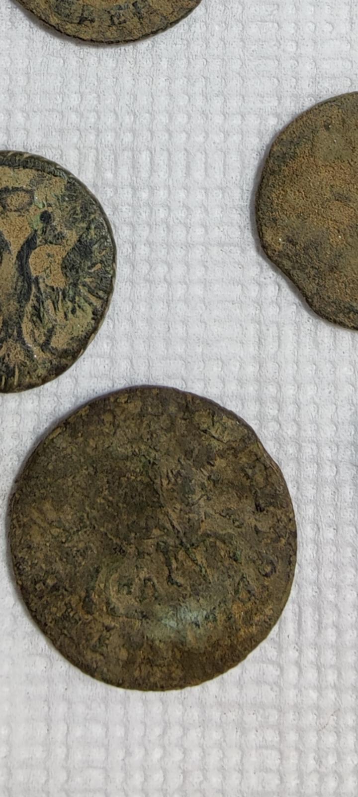 Те на монете из каталога полей в шляпе не видно, а тут сгнило так что поля у шляпы проявились как на монетах другого типа Петра1? и сапоги появились? при том что монета не гнилая крепкая сверху только песок, патина(глянцевая,не порошок) чем то похожа не византийские монеты и сплав тут какой то не простой больше похож на бронзу. В 5 метрах лежала копейка 1855года на ней патина была как порошок. Вы недооцениваете эту монету рельеф у нее высокий, что видно по фото. Внимательно посмотрите на детали у коня видна грива те детализация прочеканки высокая. И есть ли вторая такая не гнилая или даже гнилая? нету
