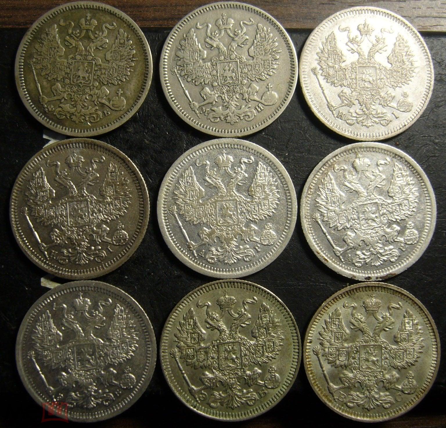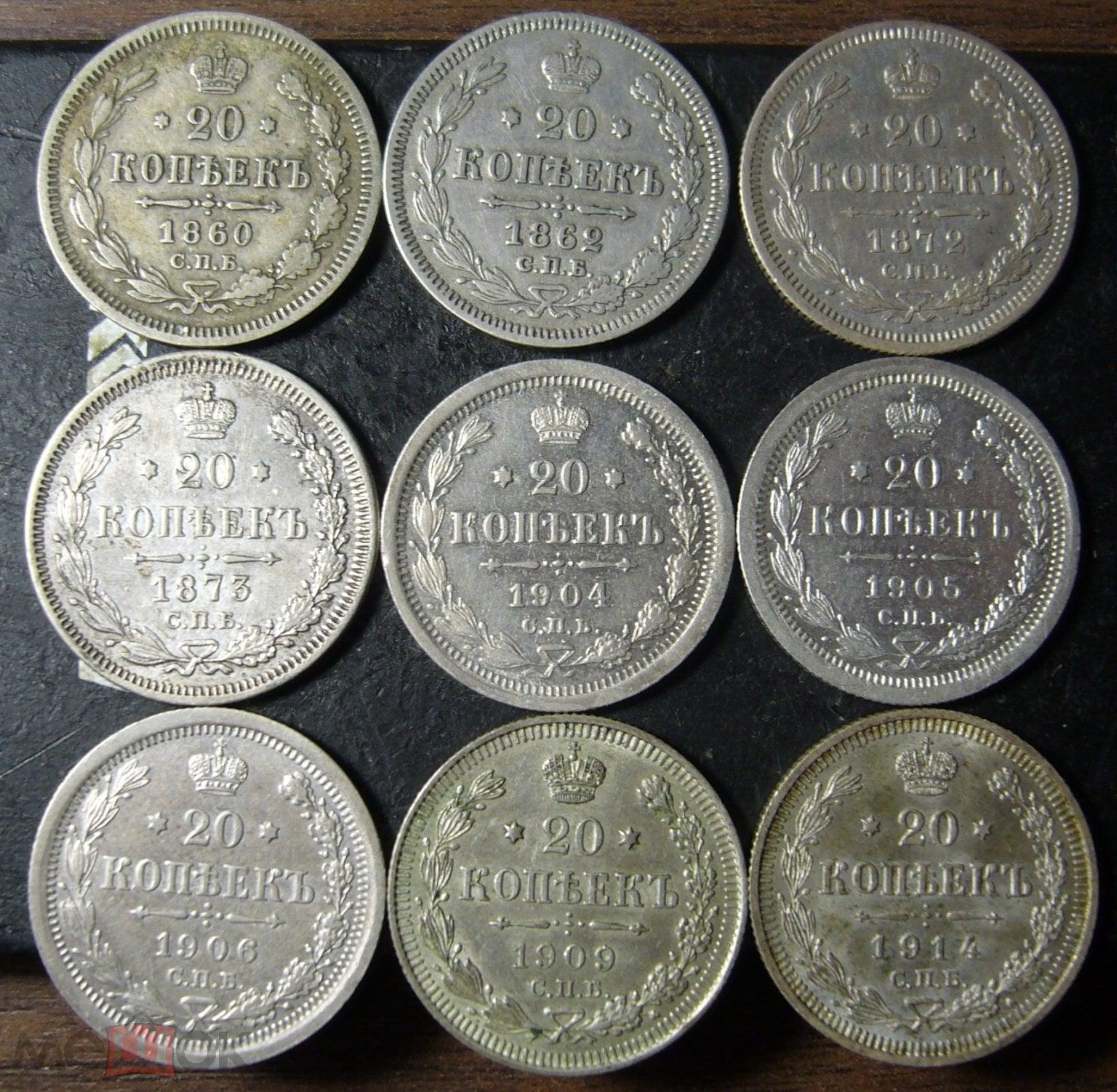 20 копеек 1860, 1862, 1872, 1873, 1904, 1905, 1906, 1909 и 1914. Оценка