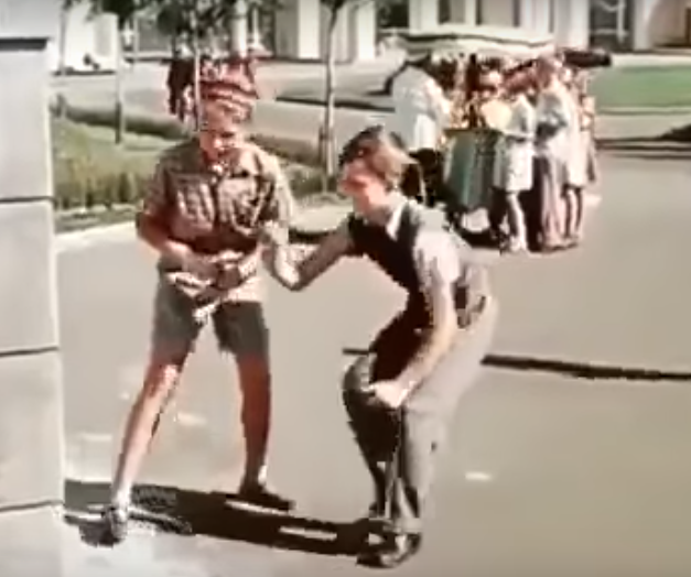 У сташеклассников пионеров была дискотека в спротзале, туда пришли физруки и стали приставать к старшей пионервожатой. Пионеры заступились, в результате пострадали мячи или окна.