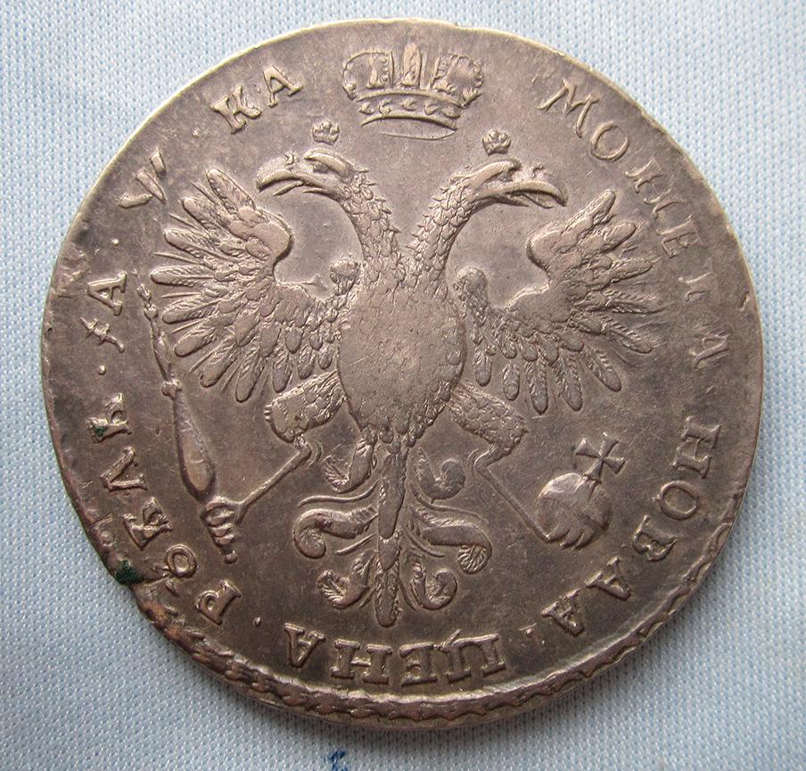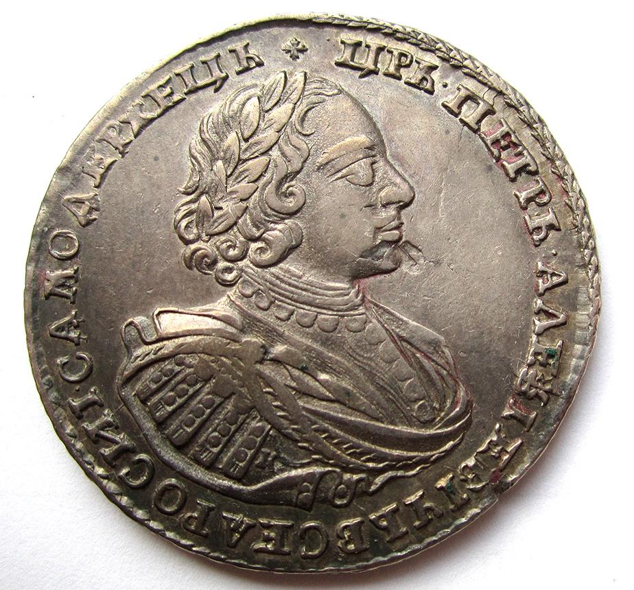 Рубль  Петра Алексеевича 1721 года с пальмой ветвью, буквой К, но над головой крест. ГМ №286,