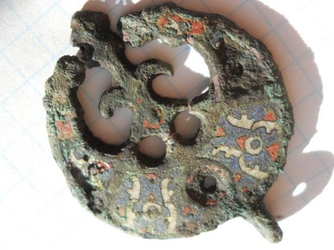 Сопутку к сожалению не знаю. Бляху купил, она из Крыма. Заинтересовал мотив вот и решил с вами обсудить. Единственно могу сказать что земля, на ней, как цемент, у римских монет такой рыжий налет бывает, не оттирается не чем, но полируется в зеркало. В дистилляте начинает размягчаться, но и патина начинает сыпаться.